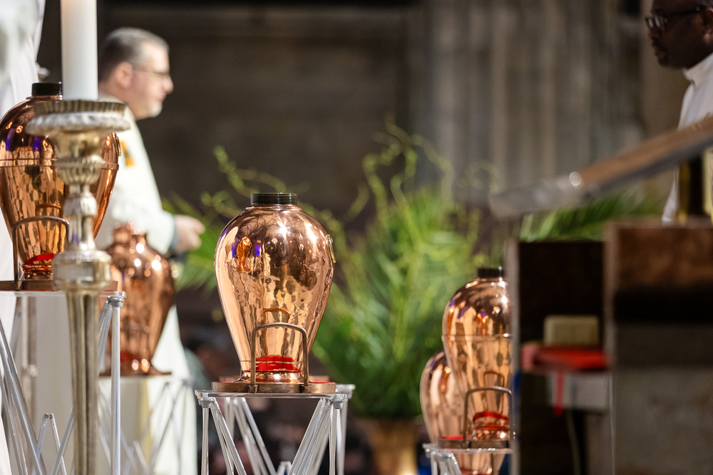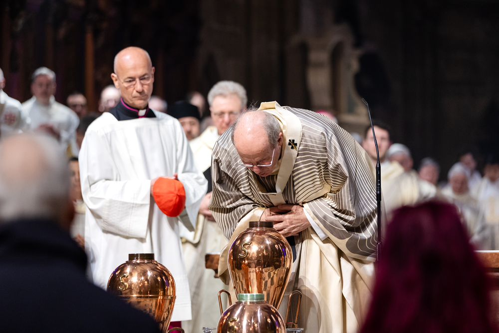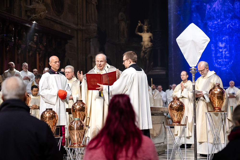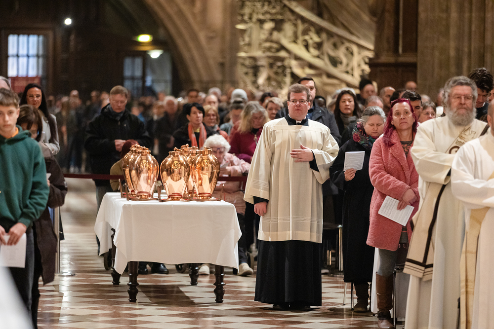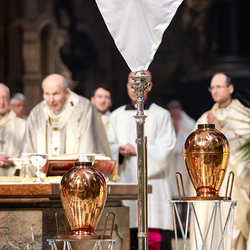 Die Weihe der Heiligen Öle in der Chrisammesse versammelt zu Beginn der Karwoche Priester, Diakone und Gläubige der Diözesen im Stephansdom. Die Priester und Diakone erneuern dabei ihr Versprechen für den Dienst in der Kirche, während die anwesenden Gläubigen die Weihe der Heiligen Öle mitfeiern. Diese Öle werden während des Jahres in den Pfarreien bei Taufen, Firmungen und Krankensalbungen verwendet.